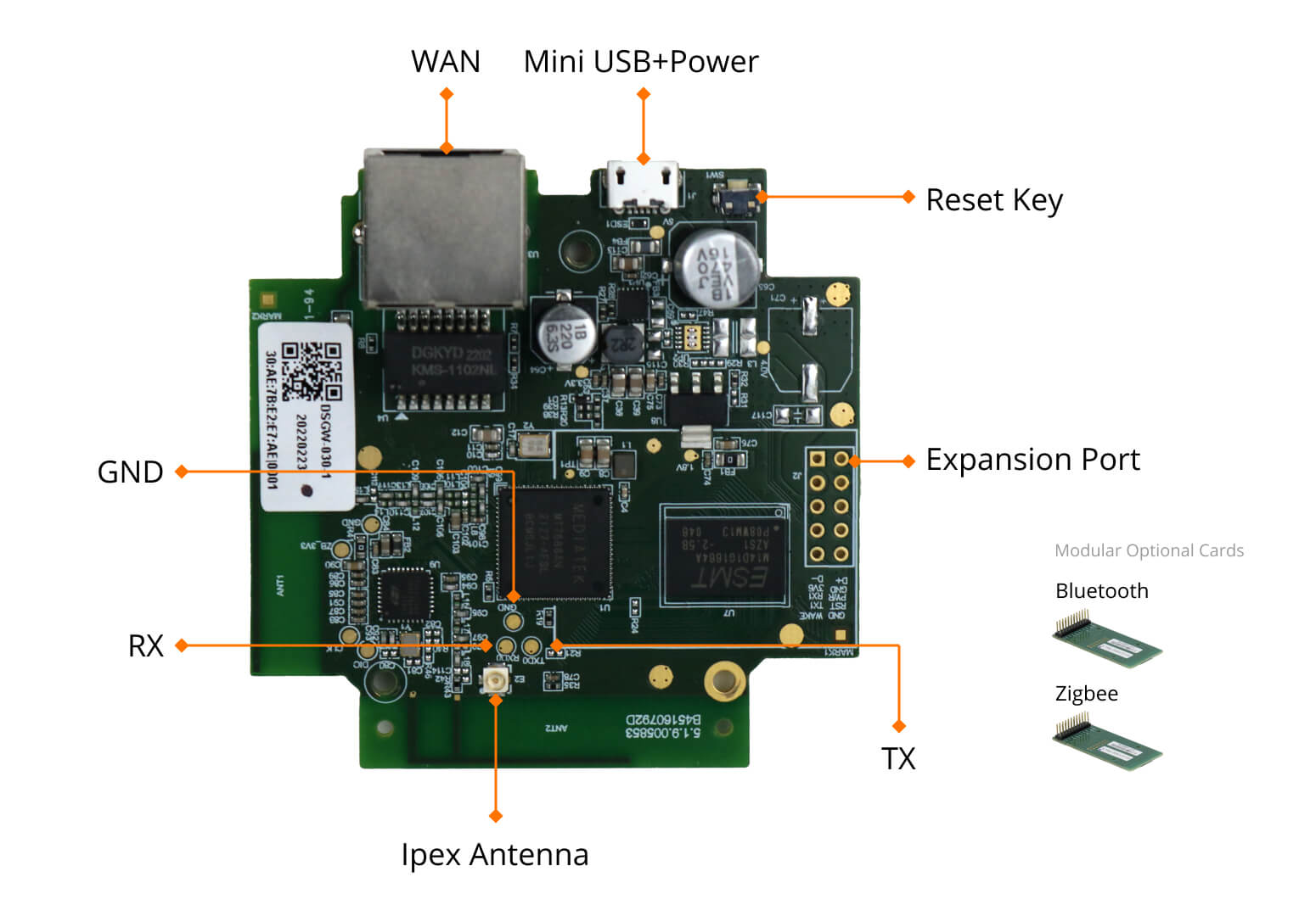 The IoT Gateway Board features an expansion port that supports various wireless modules, including Bluetooth, Zigbee. Users can select and integrate the specific modules they need, allowing for customized connectivity and flexibility in different applications