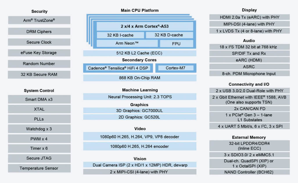 - CPU: Quad Cortex®-A53 processors operation up to 1.6 GHz Cortex®-M7 CPU operating up to 800 MHz