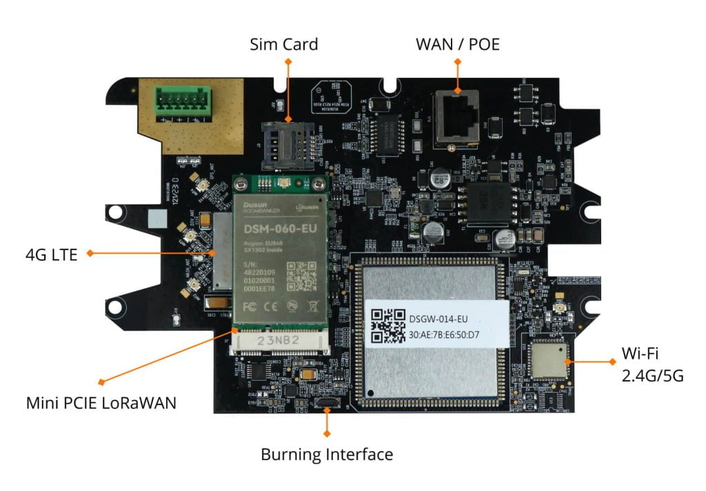 Thu thập dữ liệu từ các thiết bị đầu cuối LoRa và truyền về cloud thông qua Wi-Fi 2.4G, 4G LTE và Ethernet.